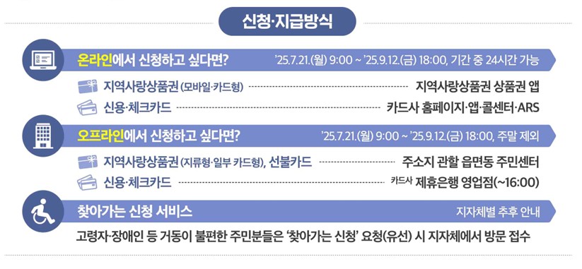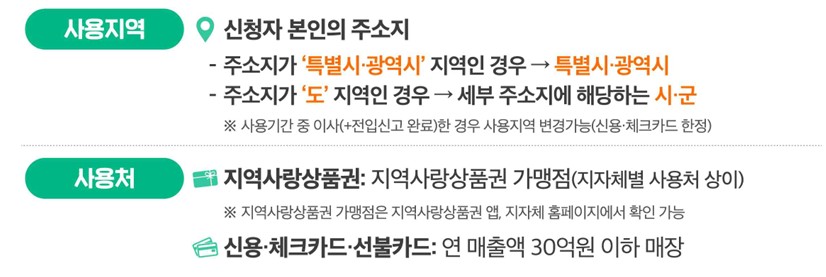 구분신청 경로신용·체크카드 카드사 앱/홈페이지/콜센터 또는 연계 은행 창구 모바일·카드형 지역사랑상품권 지자체 누리집 또는 앱 지류형 상품권 또는 선불카드 관할 읍면동 행정복지센터 방문 📌 미성년자: 세대주가 신청 / 미성년자만 있는 세대는 본인 신청 가능