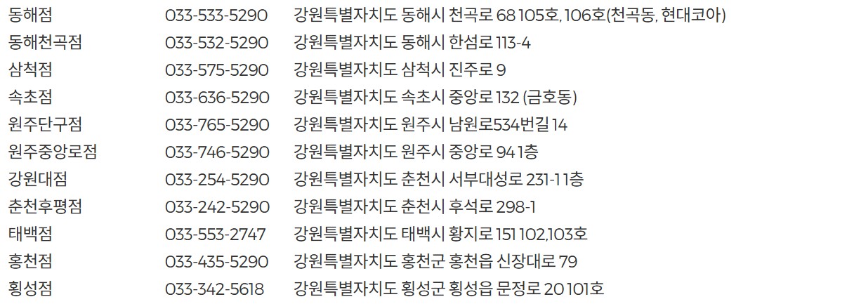 강원특별자치도는 동해시, 삼척시, 속초시, 원주시, 춘천시, 대택시, 홍천군, 횡성군에 총 11개 가맹점에서 민생회복 소비쿠폰을 사용할 수 있습니다.